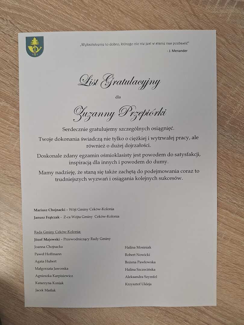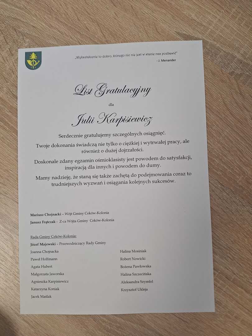 Absolwenci naszej szkoły Julia Karpisiewicz, Zuzanna Przepiórka i Wiktor Tereszkiewicz otrzymali dziś z rąk włodarzy naszej gminy nagrody ufundowane przez Radę Gminy Ceków- Kolonia za najwyższe wyniki z egzaminu ósmoklasistySerdecznie gratulujemy! Warto się uczyć !!!