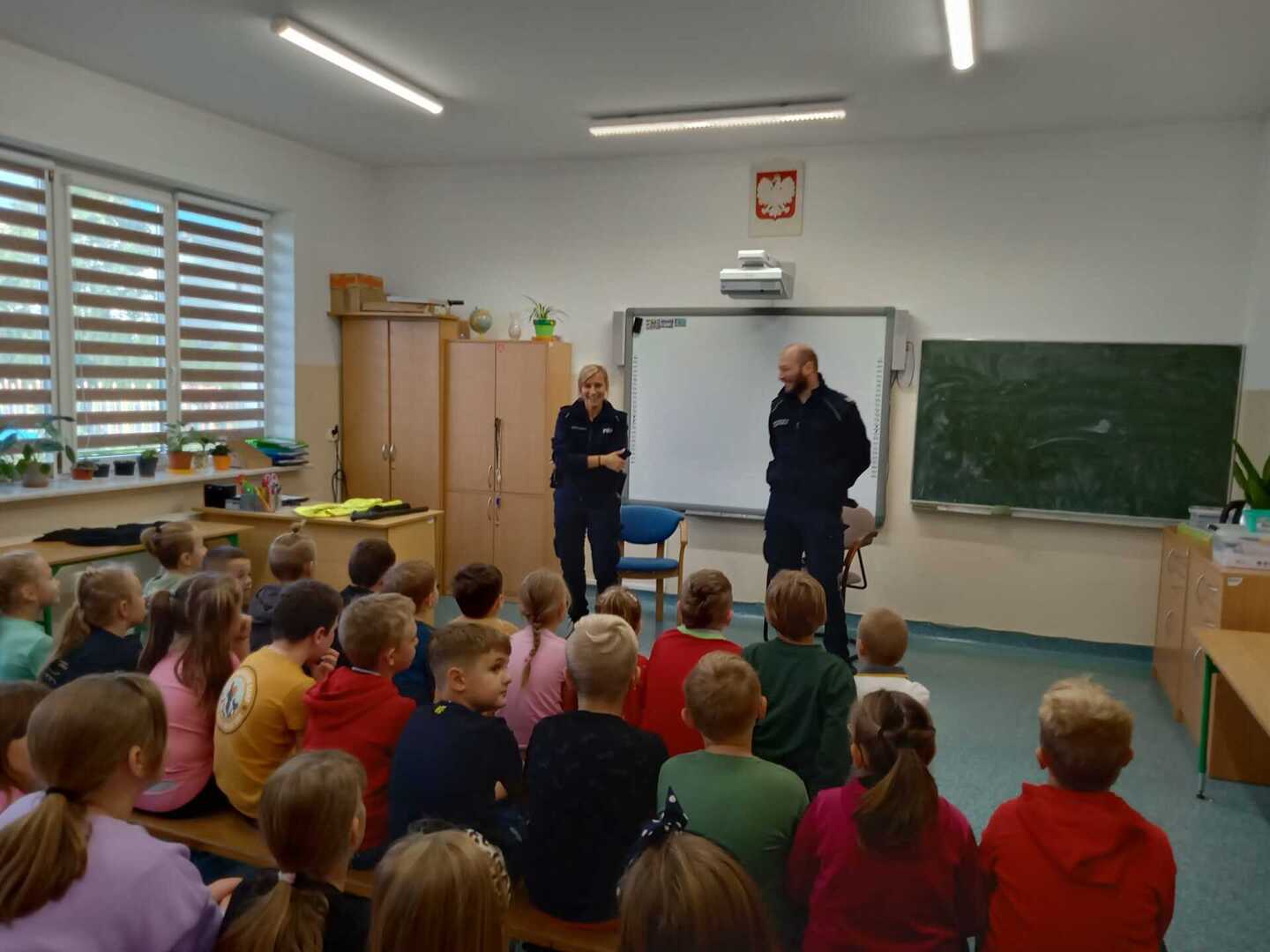 Wizyta Funkcjonariuszy Policji z komisariatu w Koźminku. Pogadanka na temat bezpieczeństwa na drodze, zasadach zachowania się podczas jazdy rowerem oraz na rolkach.Dzieci otrzymały opaski odblaskowe.