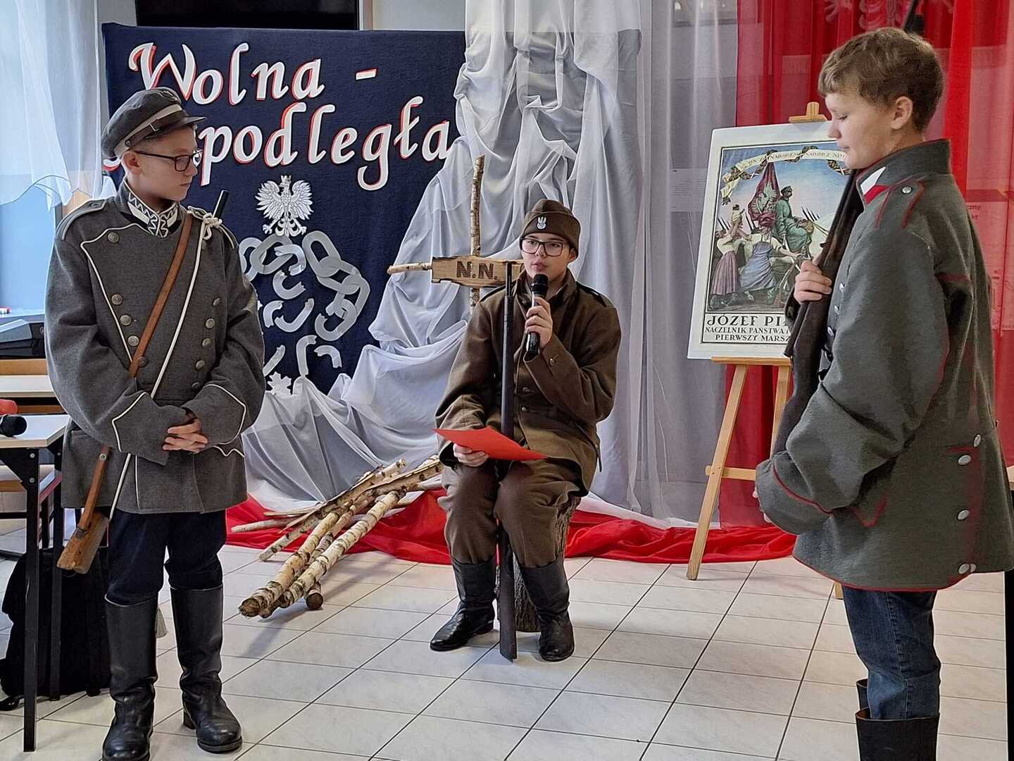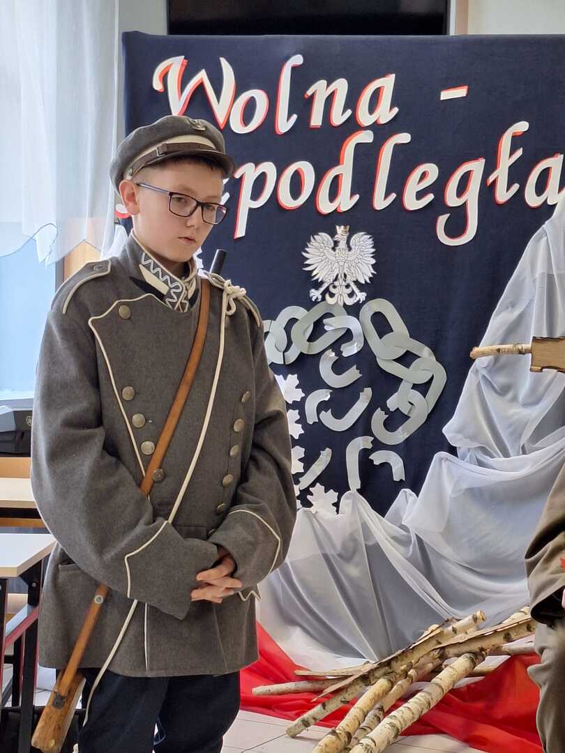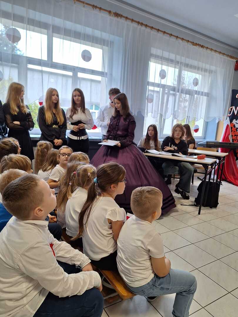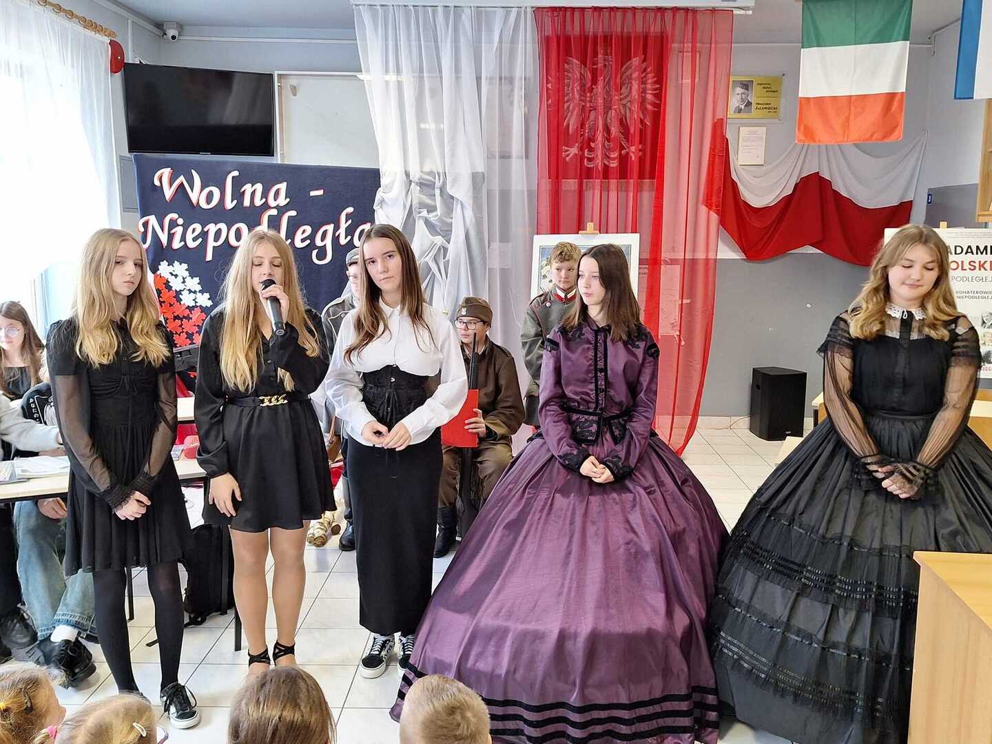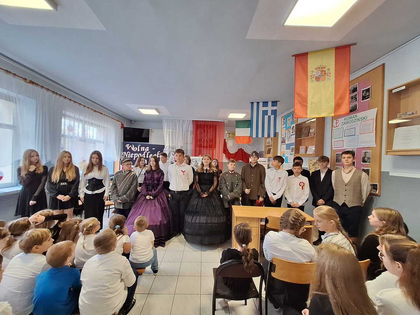 . Dzisiaj klasa siódma zabrała nas w godzinną podróż w przeszłość. Uczniowie pokazali walkę narodowowyzwyleńczą Polaków, trudne lata emigracji i zsyłek na Sybir, a także walkę podczas I wojny światowej. Na koniec uświadomili wszystkim jak cenne mogą być lekcje języka polskiego i historii. Cała społeczność szkolna odśpiewała hymn i Rotę. Apel został zorganizowany dzięki wsparciu Grupy Rekonstrukcyjnej Historycznej 25 Dywizji Piechoty przy LGD 7 ,, Kraina Nocy i Dni '' w Cekowie, skąd pozyskaliśmy stroje dla naszych aktorów.