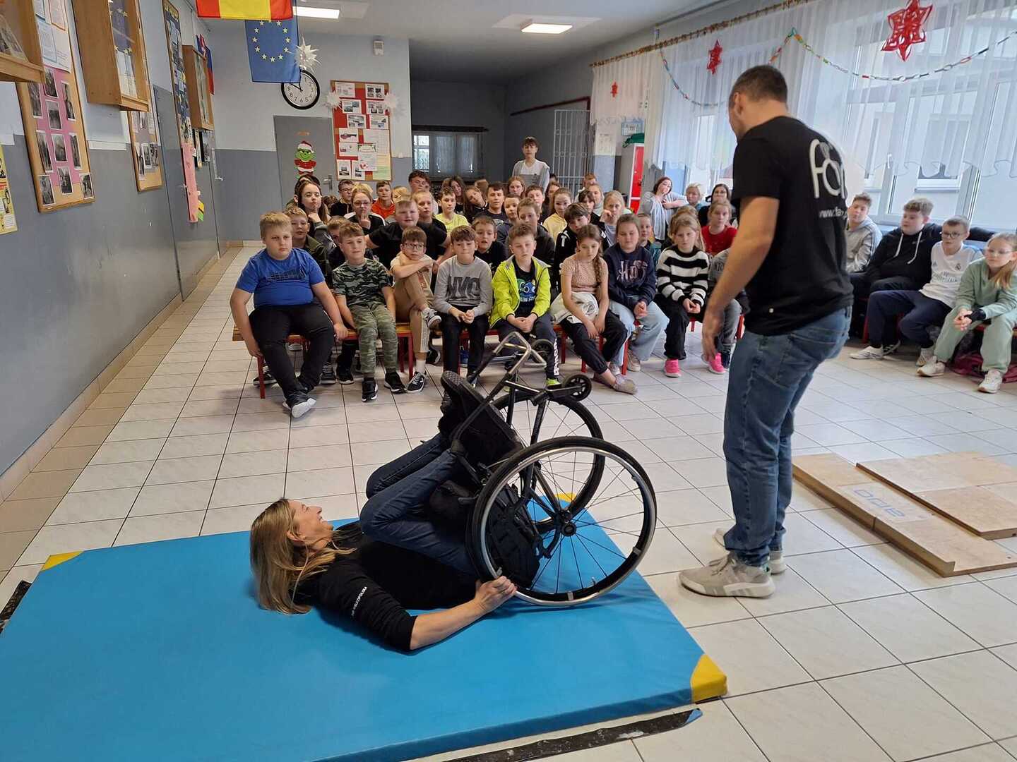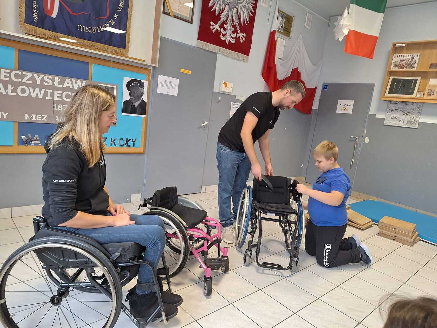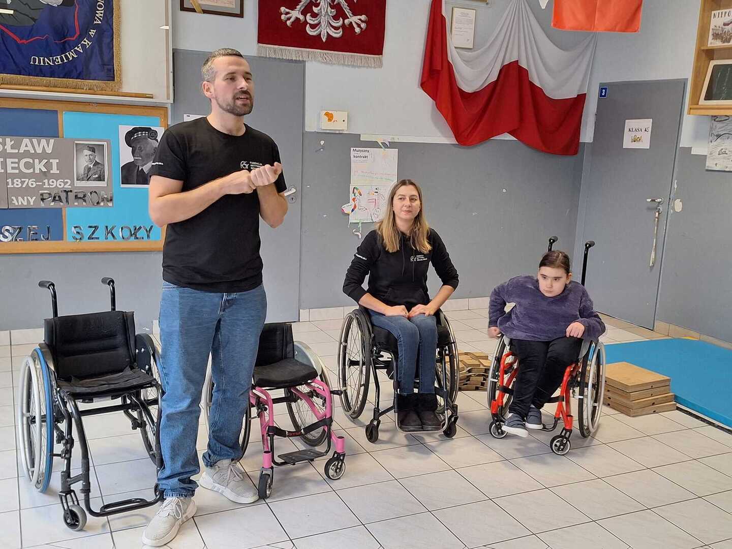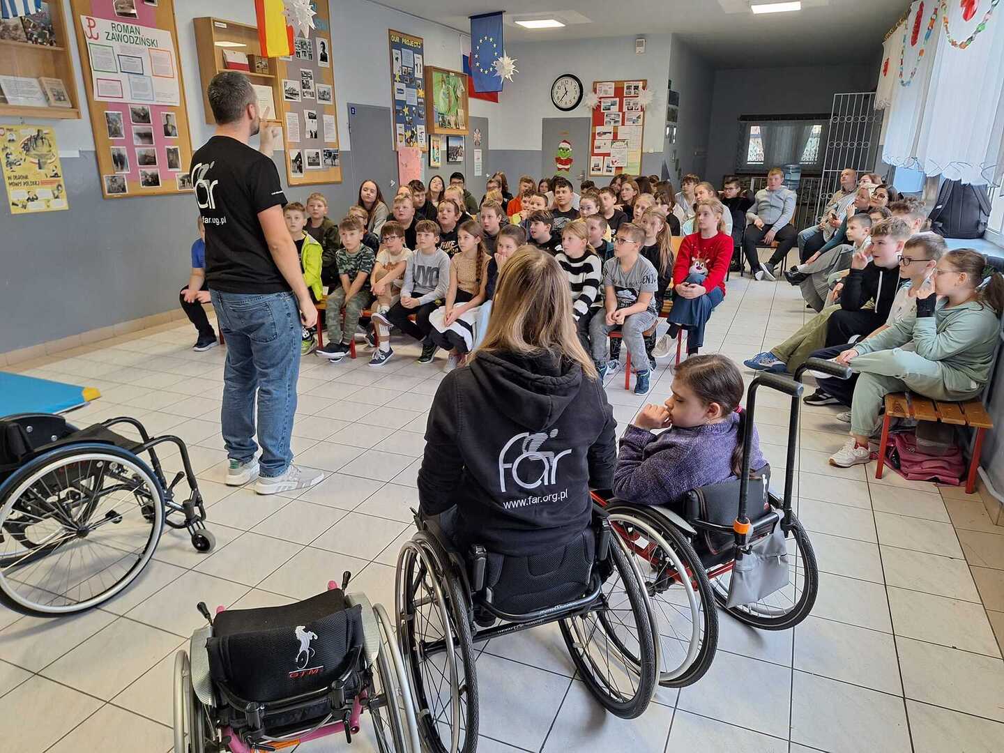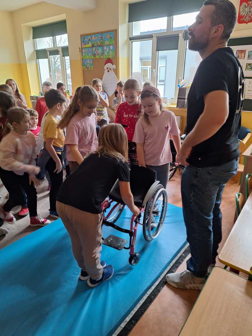 Naszą szkołę odwiedzili niecodzienni goście . Na zaproszenie Pani Agaty Hubert , która jest nauczycielem współorganizującym Laury z klasy 5 , która porusza się na wózku inwalidzkim , przyjechali do nas członkowie Fundacji Aktywnej Rehabilitacji „FAR ”z Poznania , z którą to współpracuje Laura. Pani Karolina i Pan Emil w bardzo przystępny i ciekawy sposób przybliżyli naszym uczniom klas 1-3 i 4-7 codzienne problemy ludzi poruszających się na wózkach .Była to niezwykła lekcja empatii . Poznaliśmy wiele cennych i praktycznych wskazówek jak możemy pomóc osobie niepełnosprawnej , co dla naszej społeczności ma teraz szczególne znaczenie odkąd jest z nami Laura. Dziękujemy bardzo ,że mogliśmy wziąć udział w takim wydarzeniu.Warto wiedzieć więcej ,aby sprawniej nieść pomoc