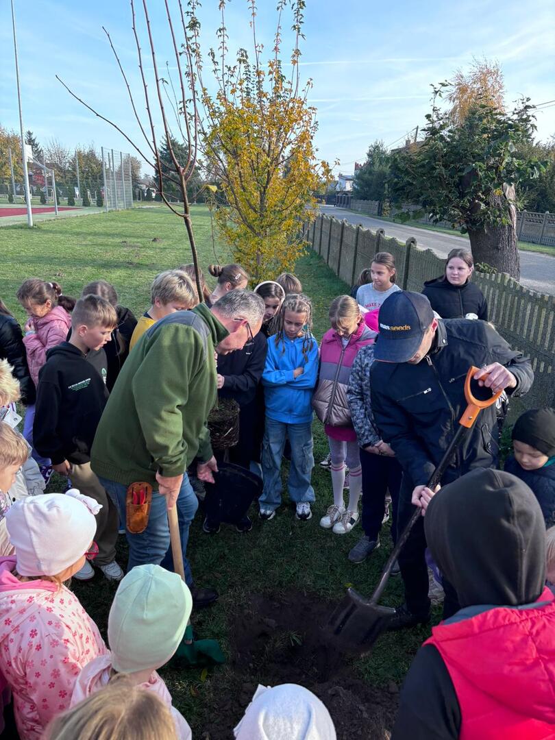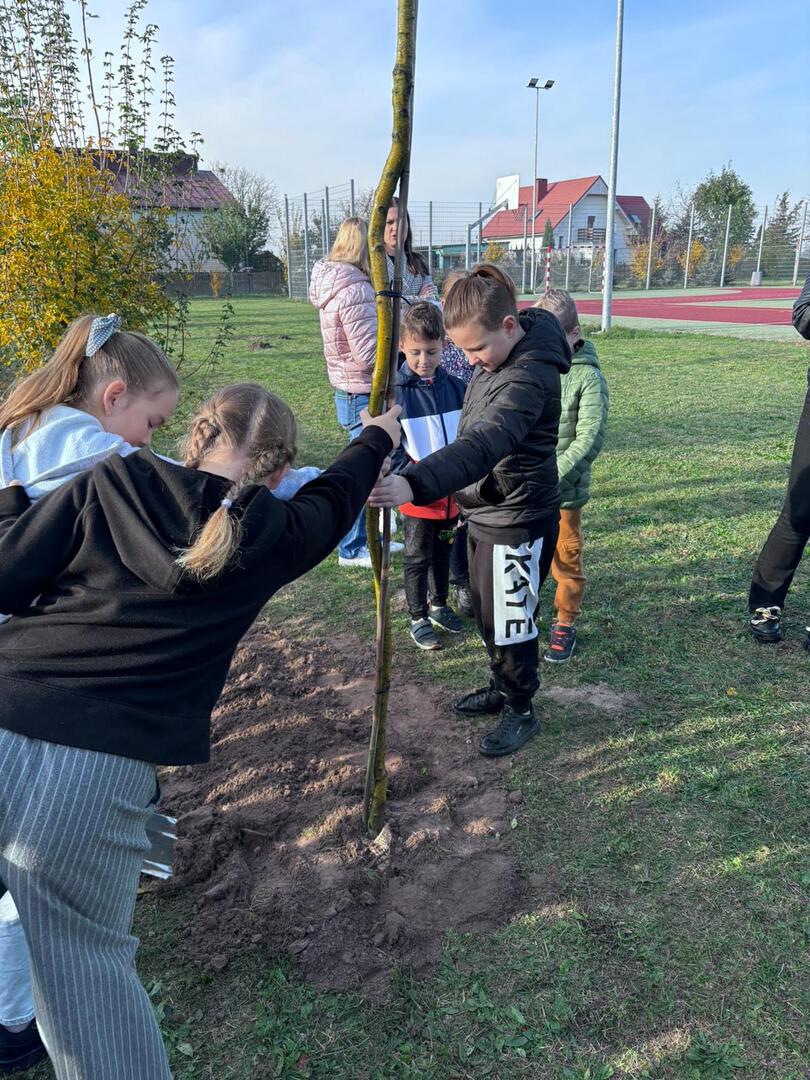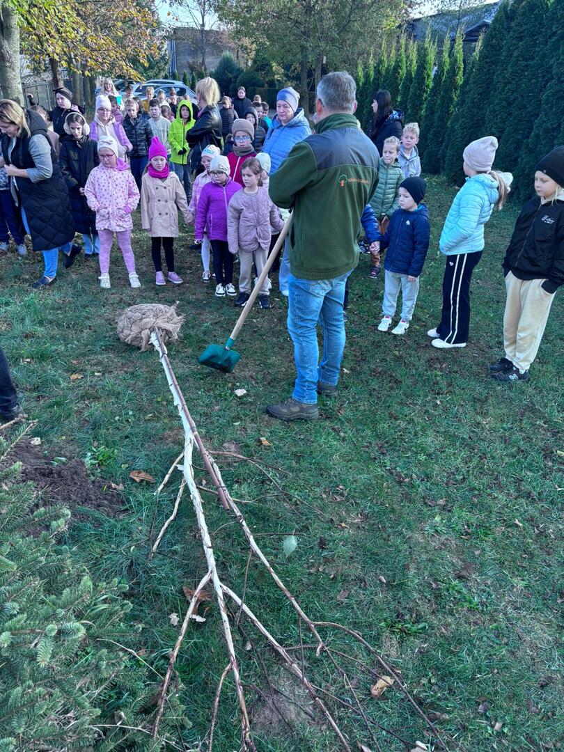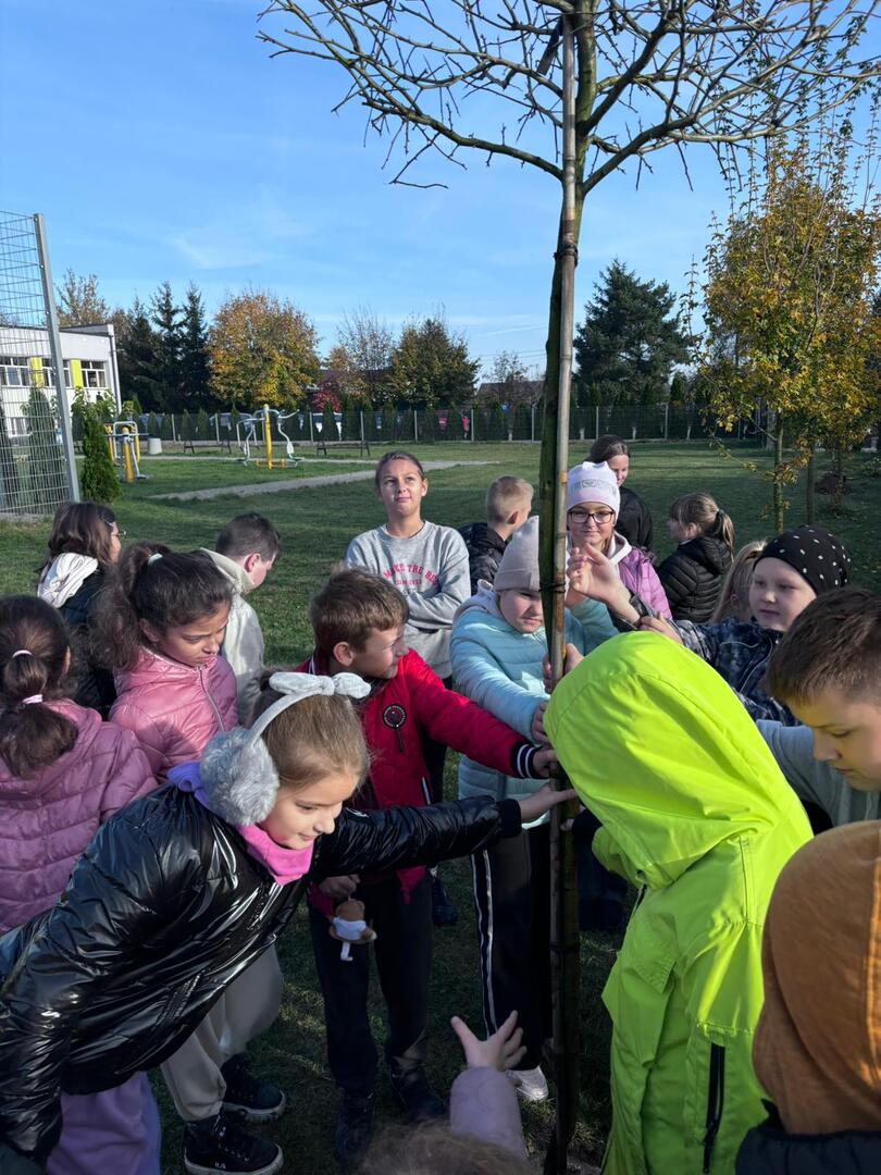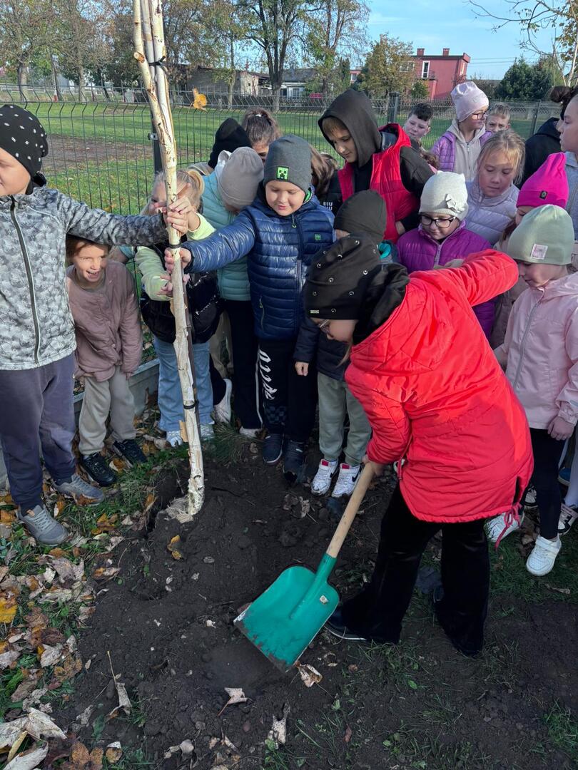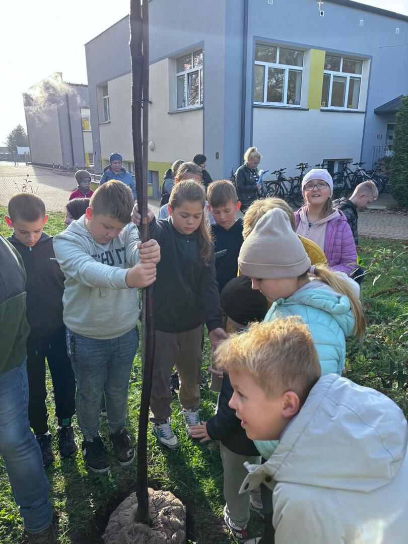 Dzięki współpracy ze Stowarzyszeniem Aglomeracja Kalisko-Ostrowska, w środę 23.10.2024 r., uczniowie klas I-IV wzięli udział w akcji sadzenia drzew. W tym dniu gościliśmy również przedstawiciela Nadleśnictwa Kalisz. W ramach akcji uczniowie zasadzili 10 drzew takich jak: lipa drobnolistna, klon, buk, brzoza, głóg. Celem przeprowadzonych warsztatów terenowych było upowszechnianie wiedzy ekologicznej i przyrodniczej wśród dzieci i młodzieży.