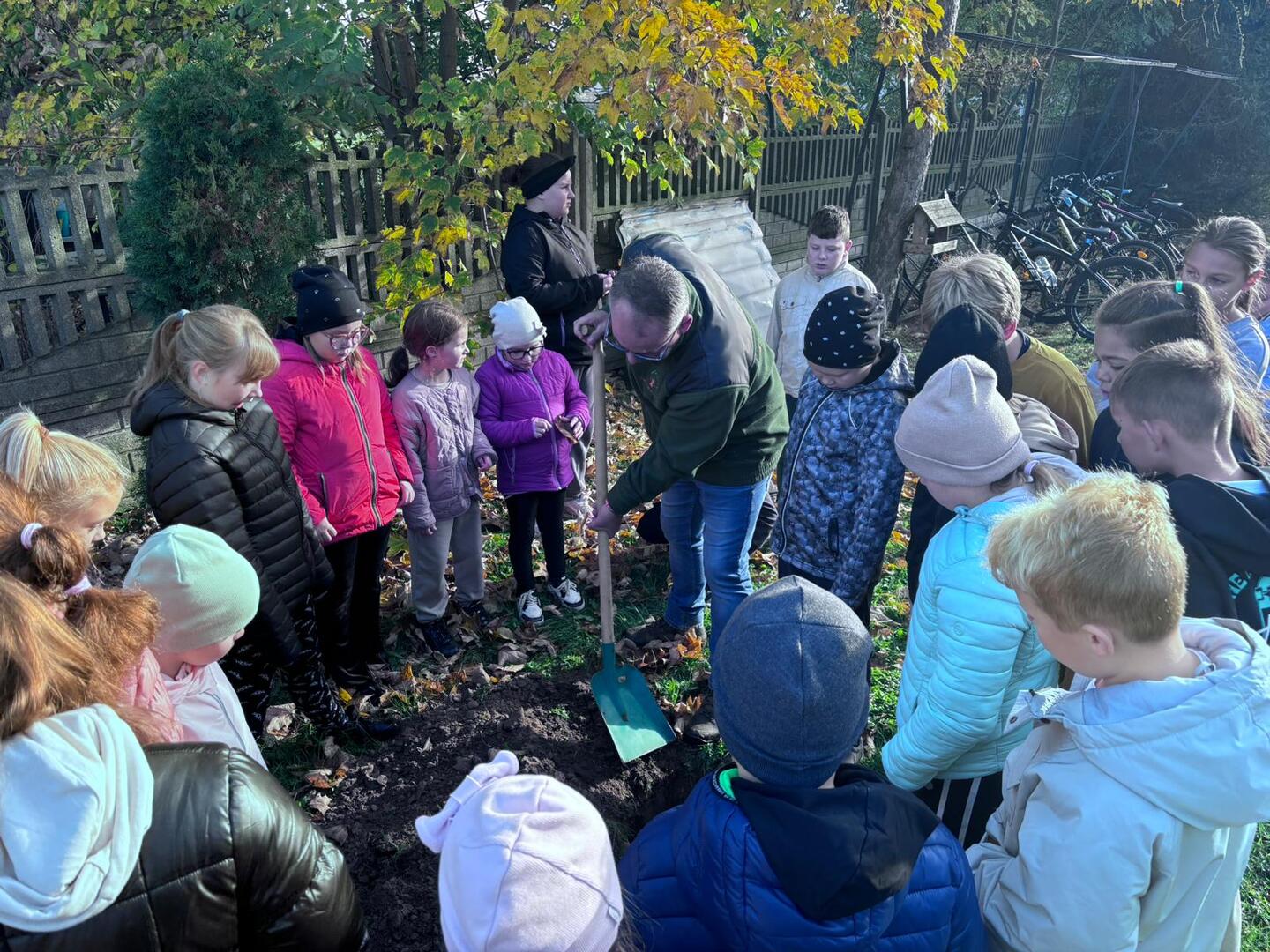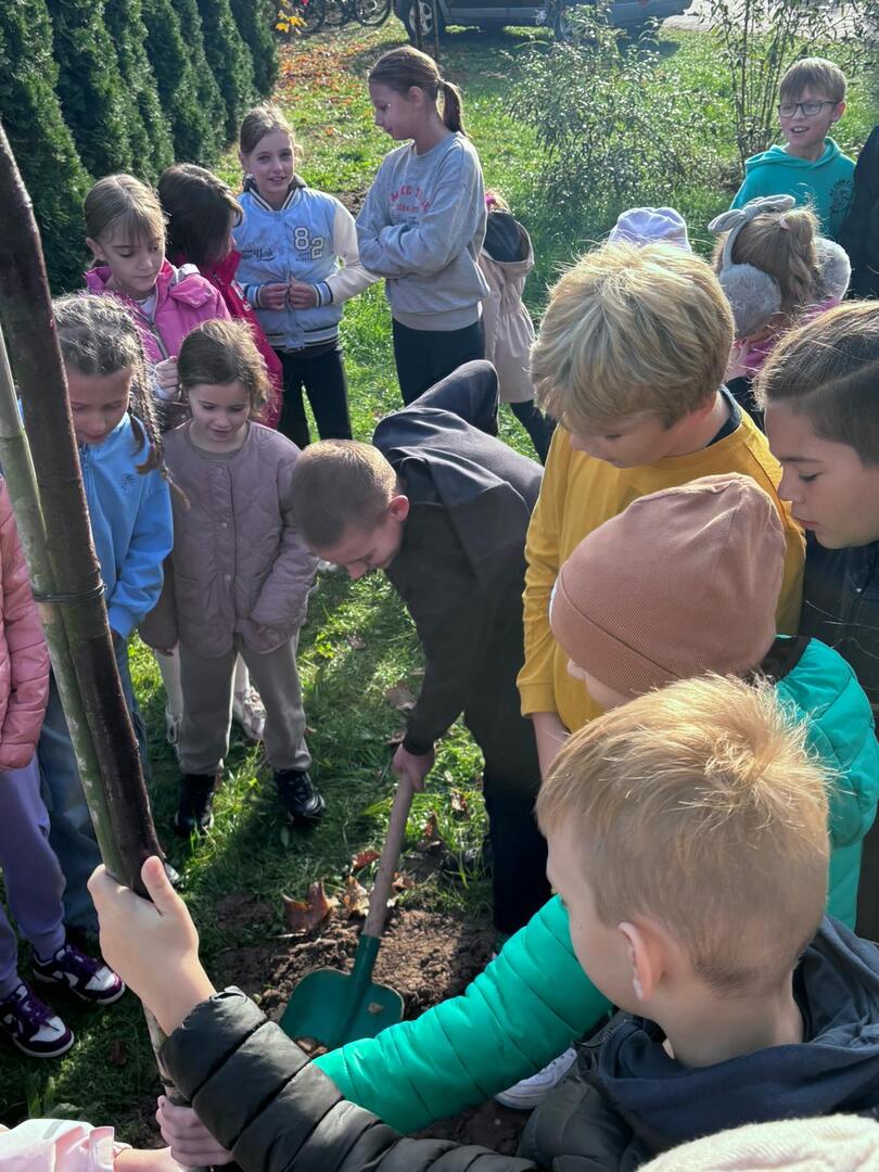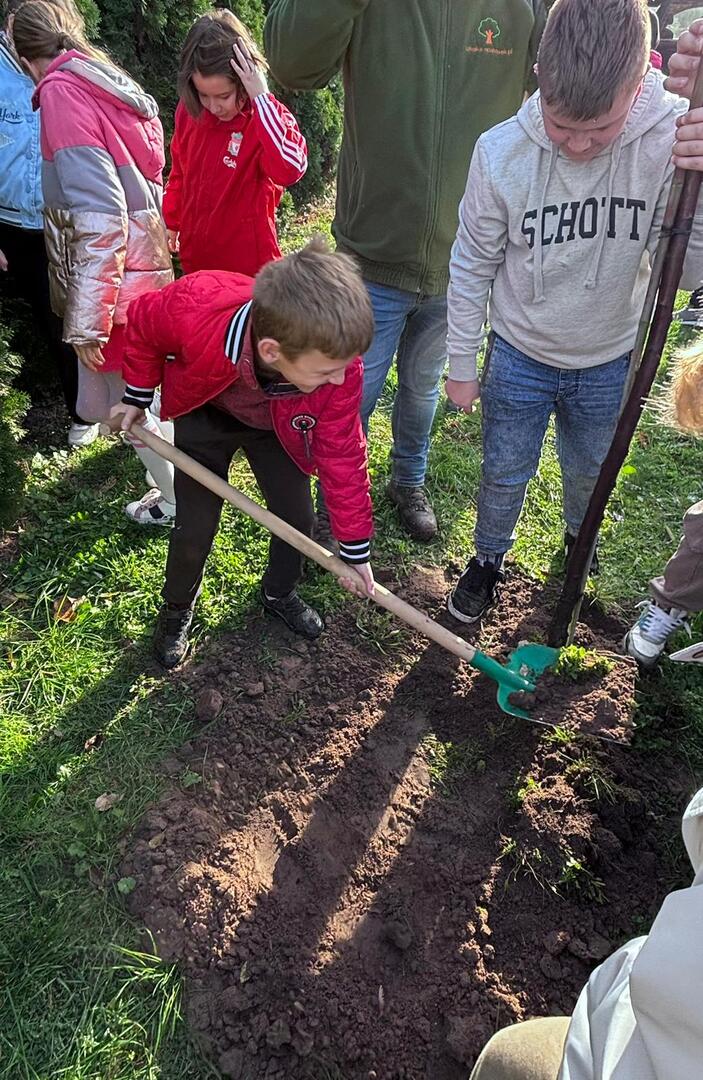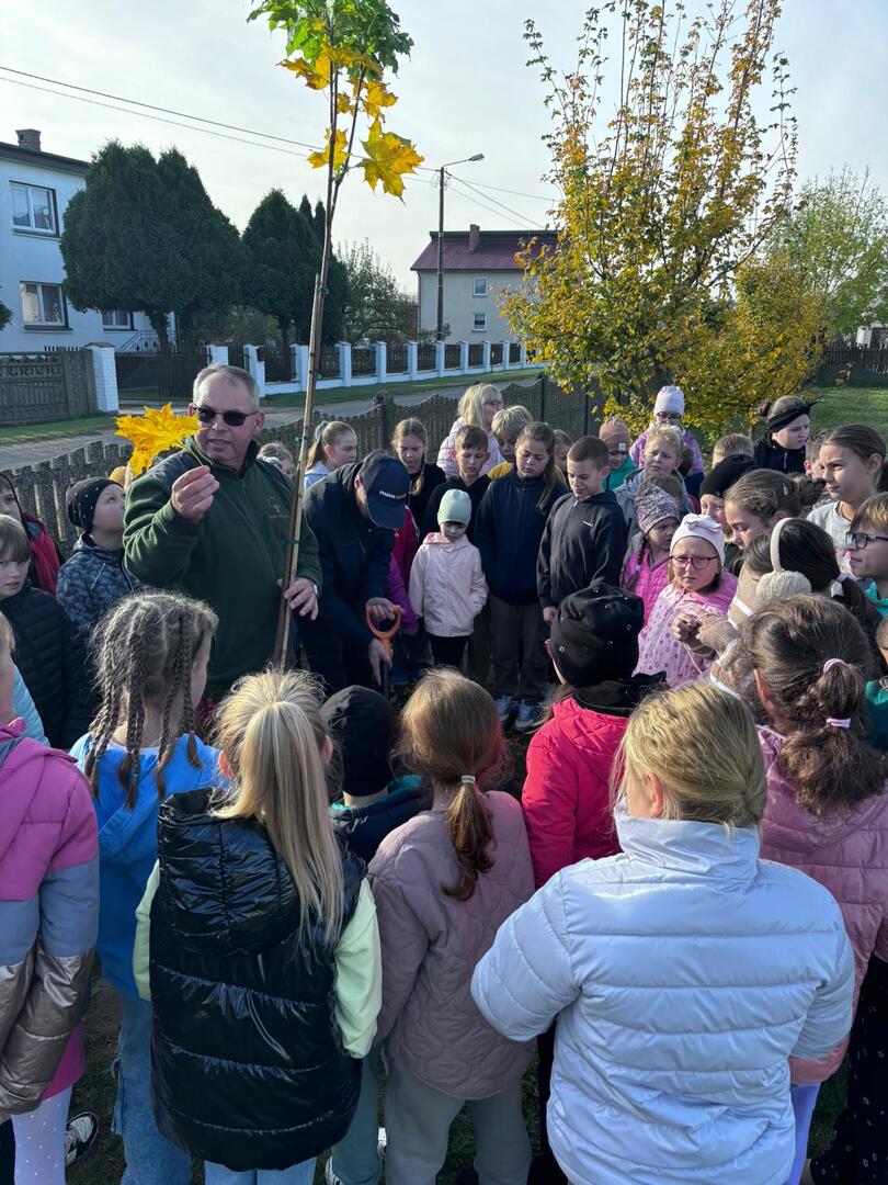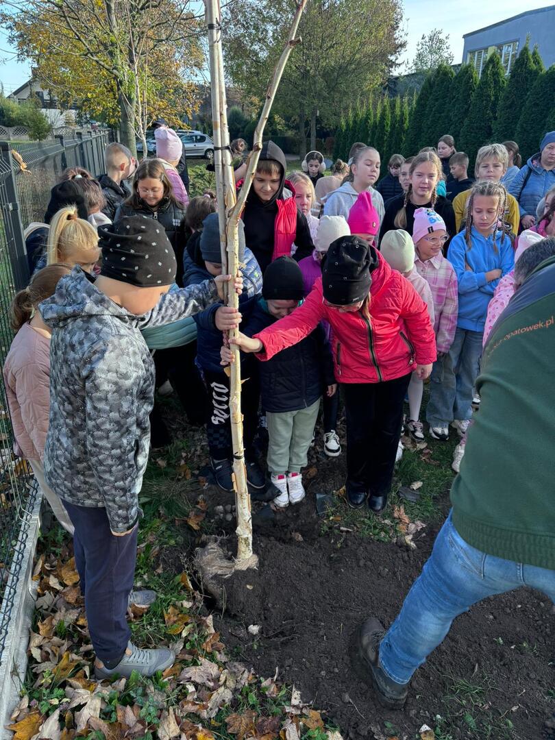 Dzięki współpracy ze Stowarzyszeniem Aglomeracja Kalisko-Ostrowska, w środę 23.10.2024 r., uczniowie klas I-IV wzięli udział w akcji sadzenia drzew. W tym dniu gościliśmy również przedstawiciela Nadleśnictwa Kalisz. W ramach akcji uczniowie zasadzili 10 drzew takich jak: lipa drobnolistna, klon, buk, brzoza, głóg. Celem przeprowadzonych warsztatów terenowych było upowszechnianie wiedzy ekologicznej i przyrodniczej wśród dzieci i młodzieży.