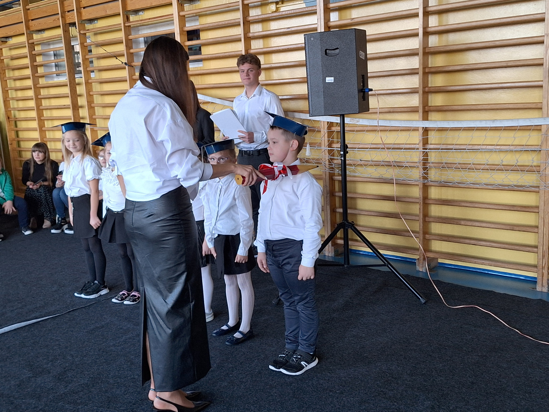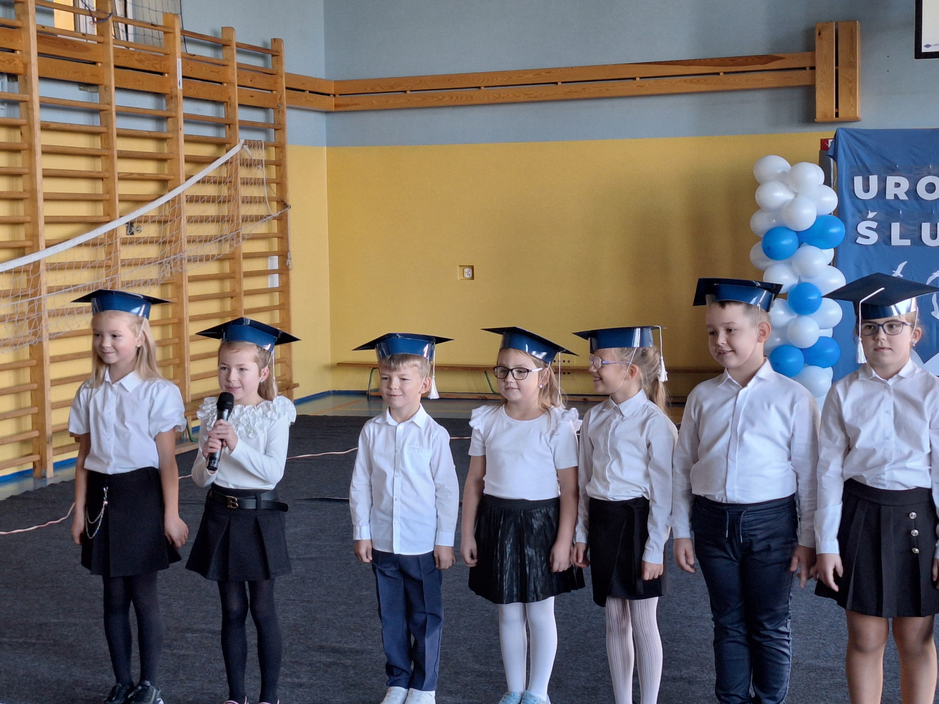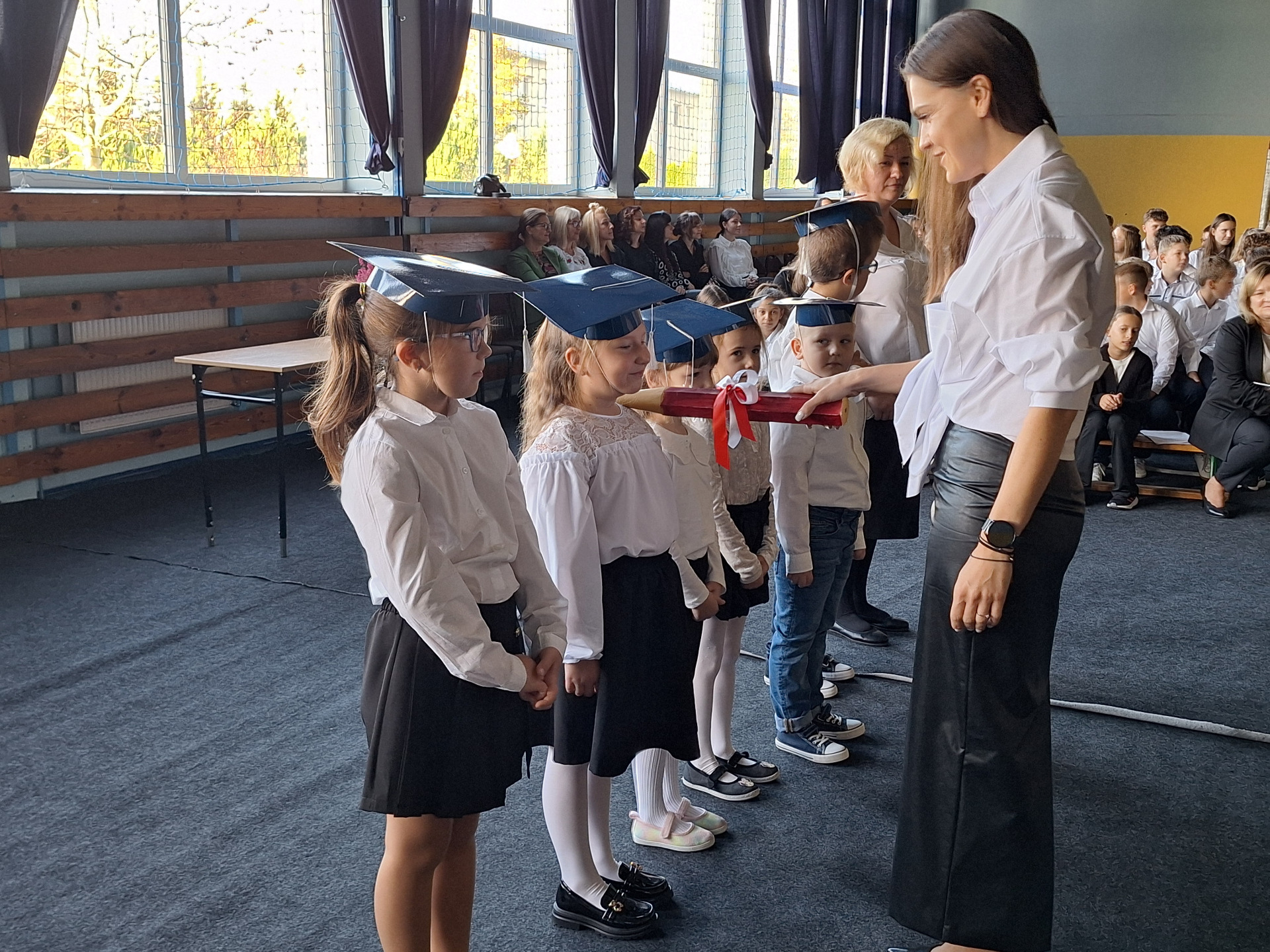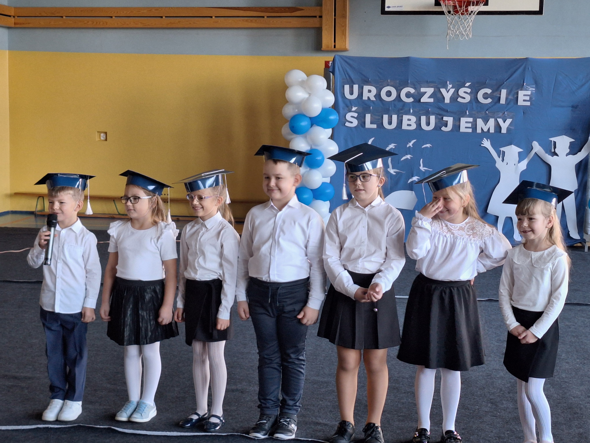15 października 2024 roku w naszej szkole odbyła się uroczystość pasowania na ucznia. Odświętnie ubrani pierwszoklasiści w obecności zaproszonych gości z przejęciem zaprezentowali przygotowane wierszyki, taniec i zaśpiewali piosenki. Po złożeniu ślubowania Pani Dyrektor Anna Kwiatkowska dokonała symbolicznego pasowania na ucznia. Pierwszoklasiści otrzymali pamiątkowe dyplomy oraz drobne upominki przygotowane przez rodziców i samorząd uczniowski. Wszystkim Pierwszakom życzymy sukcesów w murach naszej szkoły i tego, aby ten dzień pozostał w ich pamięciach jako niezapomniana chwila. Rodzicom gratulujemy wspaniałych pociech.