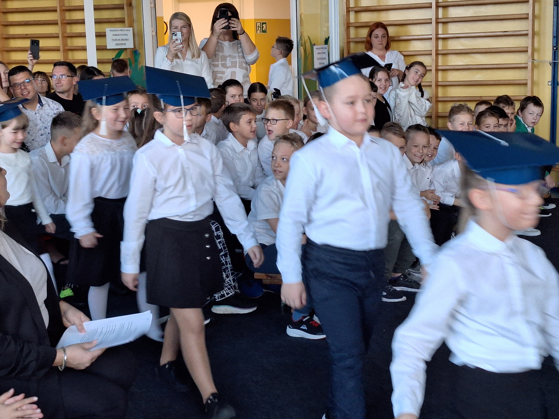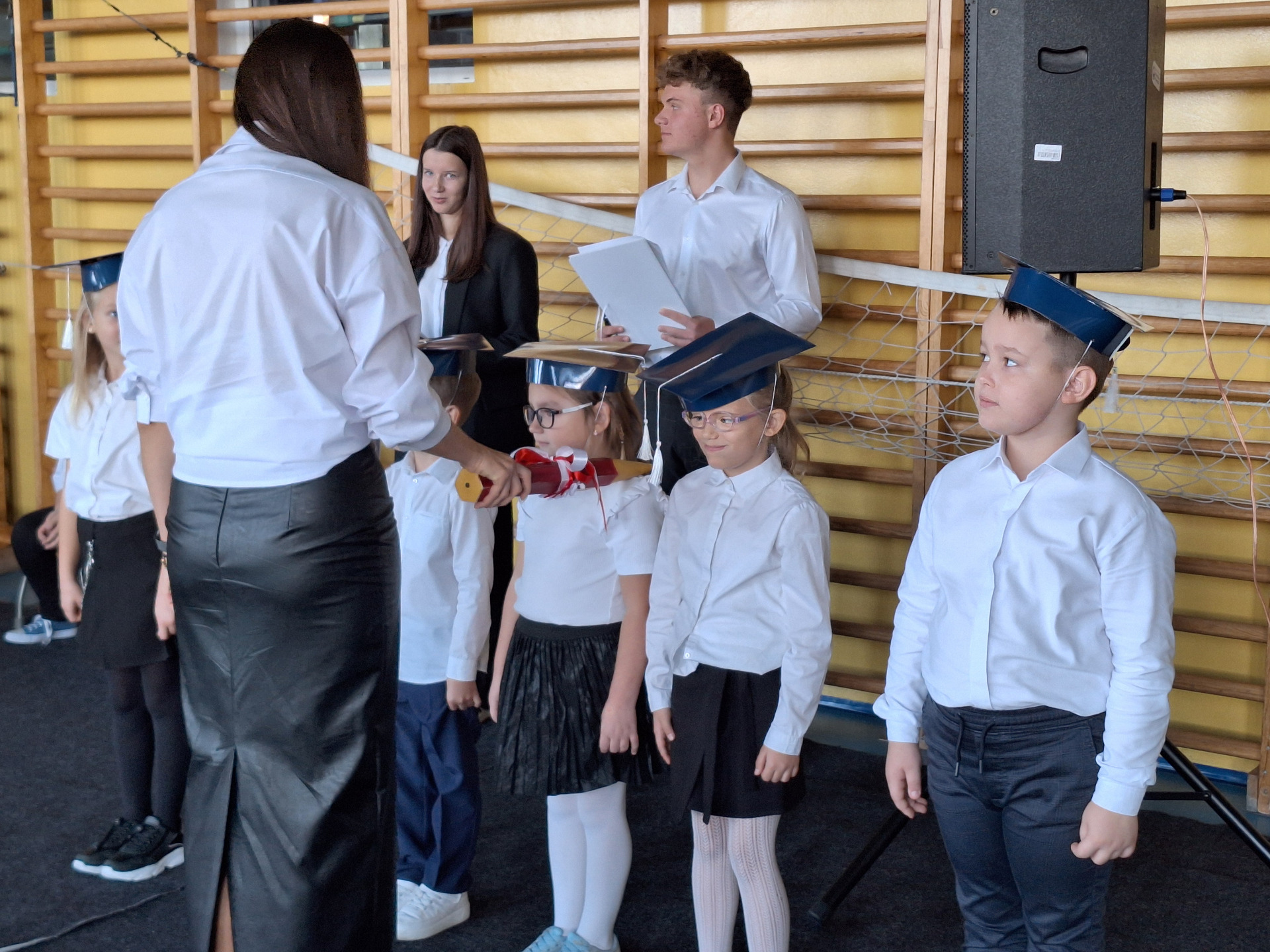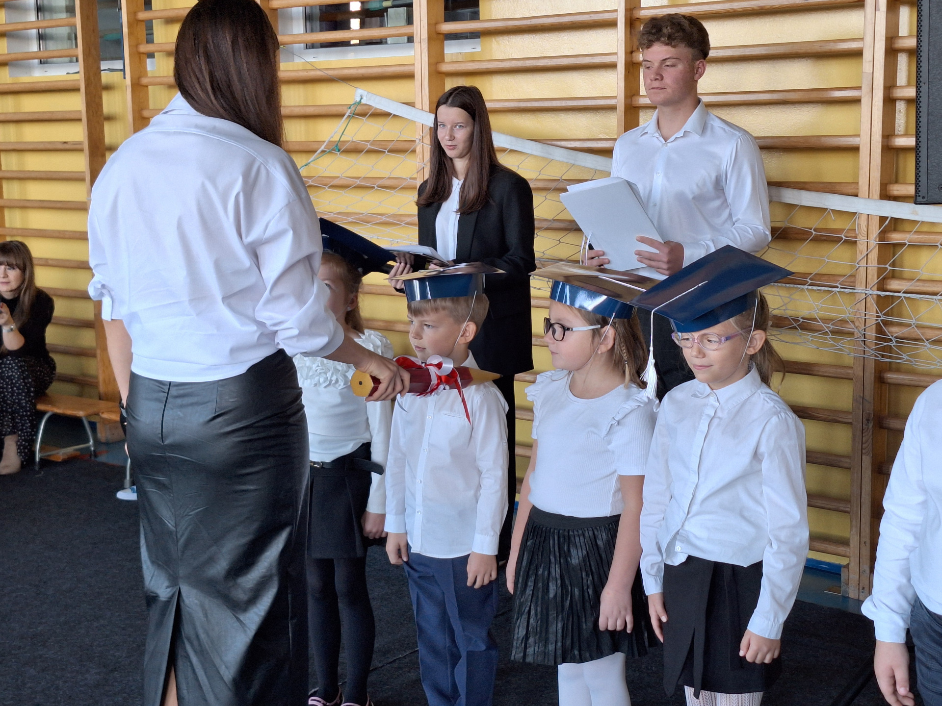 15 października 2024 roku w naszej szkole odbyła się uroczystość pasowania na ucznia. Odświętnie ubrani pierwszoklasiści w obecności zaproszonych gości z przejęciem zaprezentowali przygotowane wierszyki, taniec i zaśpiewali piosenki. Po złożeniu ślubowania Pani Dyrektor Anna Kwiatkowska dokonała symbolicznego pasowania na ucznia. Pierwszoklasiści otrzymali pamiątkowe dyplomy oraz drobne upominki przygotowane przez rodziców i samorząd uczniowski. Wszystkim Pierwszakom życzymy sukcesów w murach naszej szkoły i tego, aby ten dzień pozostał w ich pamięciach jako niezapomniana chwila. Rodzicom gratulujemy wspaniałych pociech.