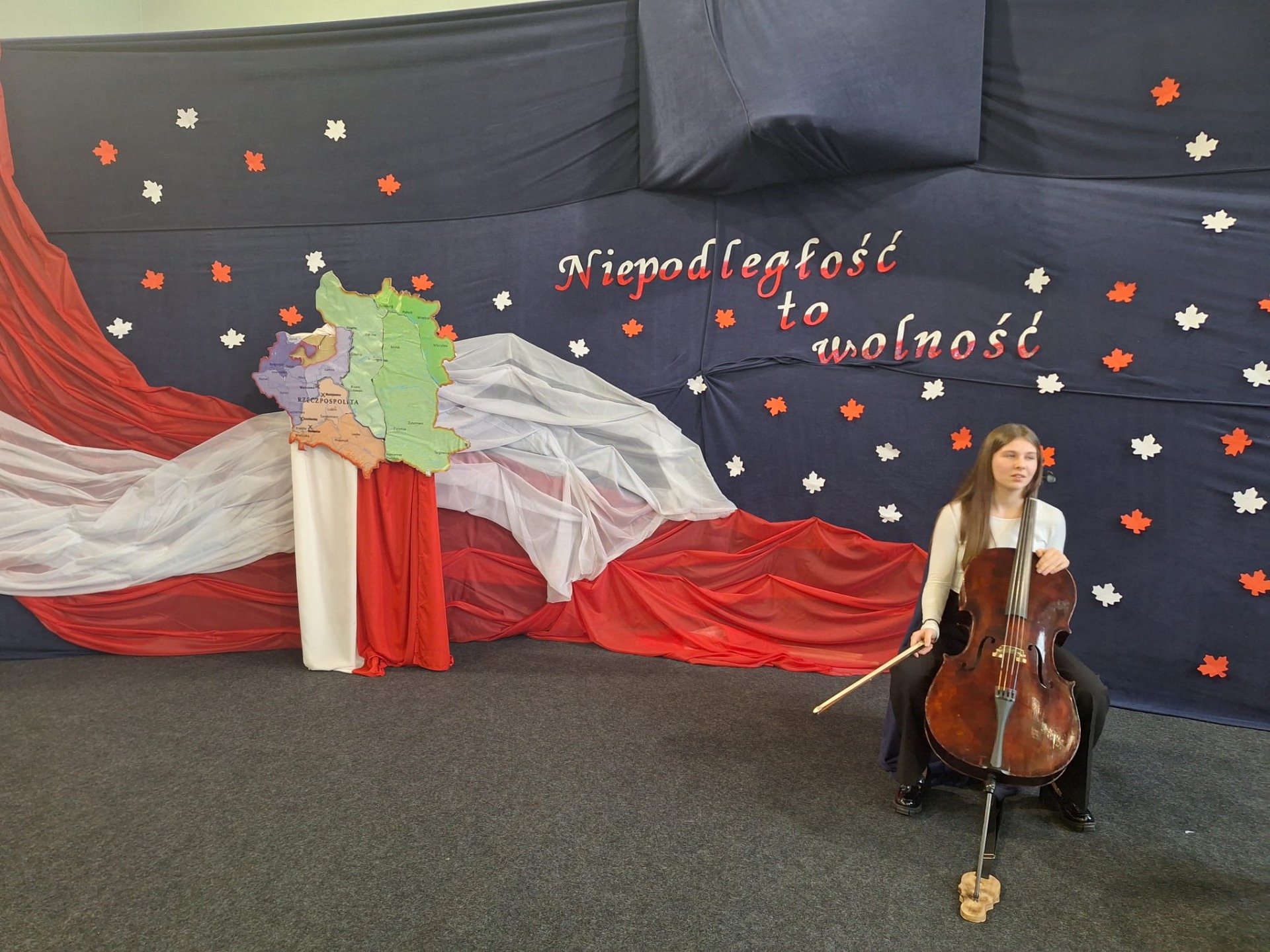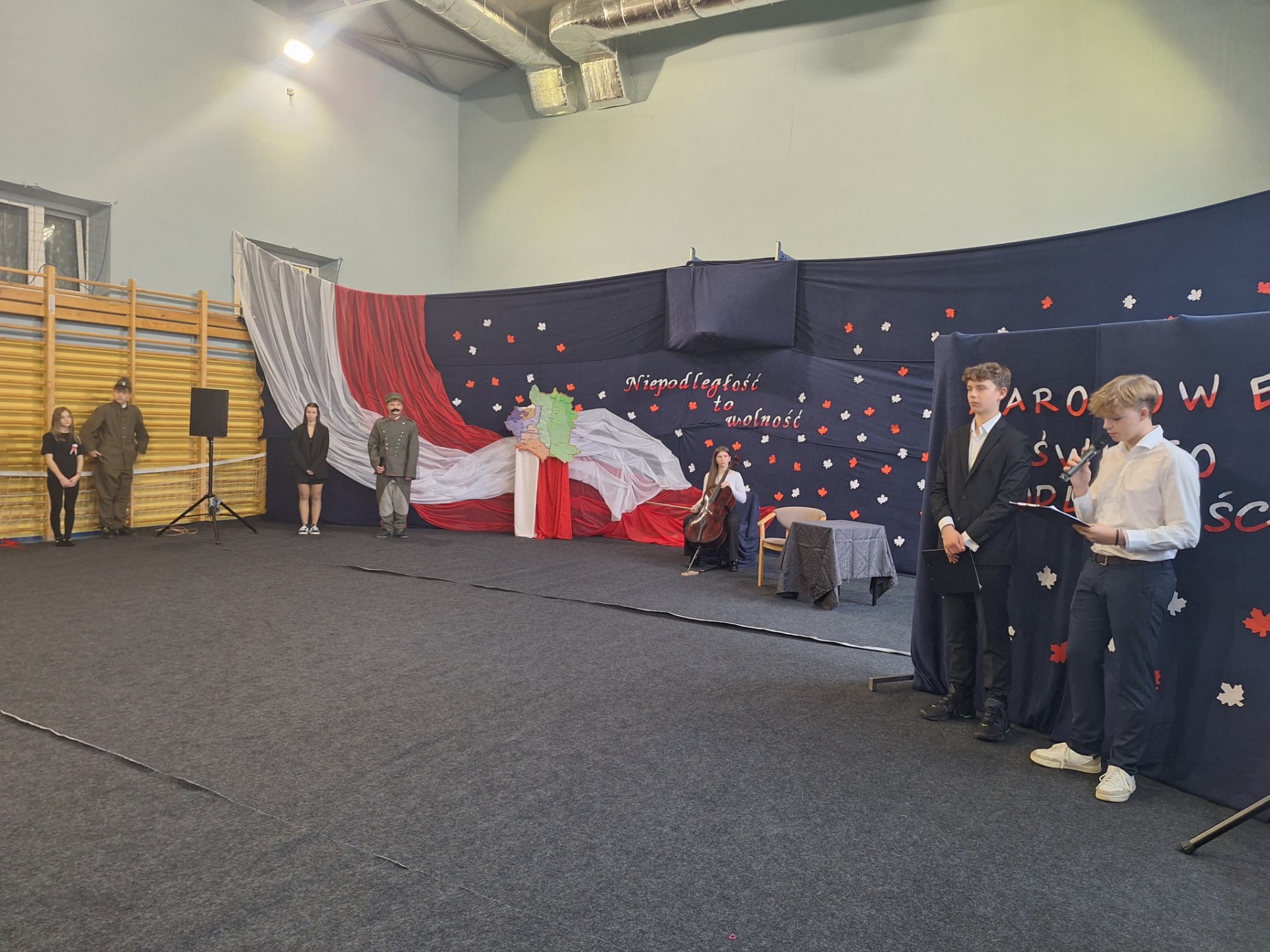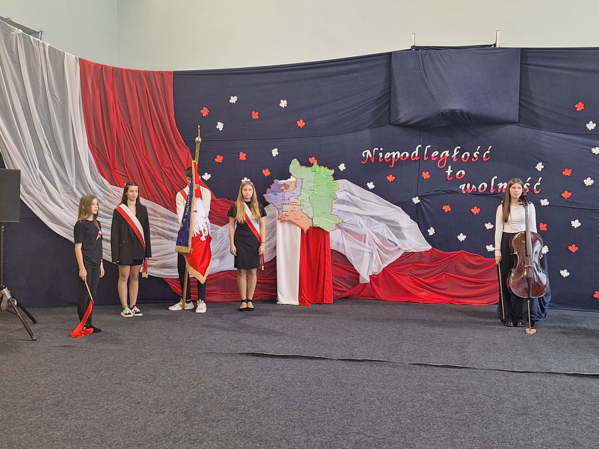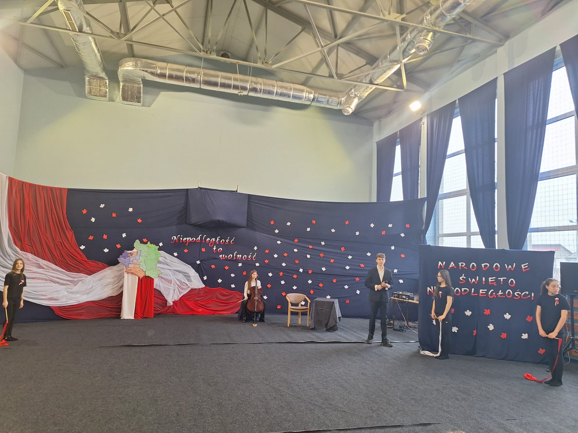 W środę 13 listopada uczniowie klasy 8 przypomnieli całej społeczności jak trudną drogę do niepodległości przeszła Polska przez 123 lata niewoli. Wspomnieli o walkach narodowowyzwoleńczych, o niezłomnej postawie Polaków w zmaganiach z rusyfikacją i germanizacją, o trudnych latach I wojny światowej. Występ miał piękną oprawę muzyczną. Na wiolonczeli zagrała Maja Łuków. Dziewczynki z klasy szóstej i ósmej zaprezentowały m.in. taniec z szarfami, a Wiktoria Goszczyńska taniec wolności.