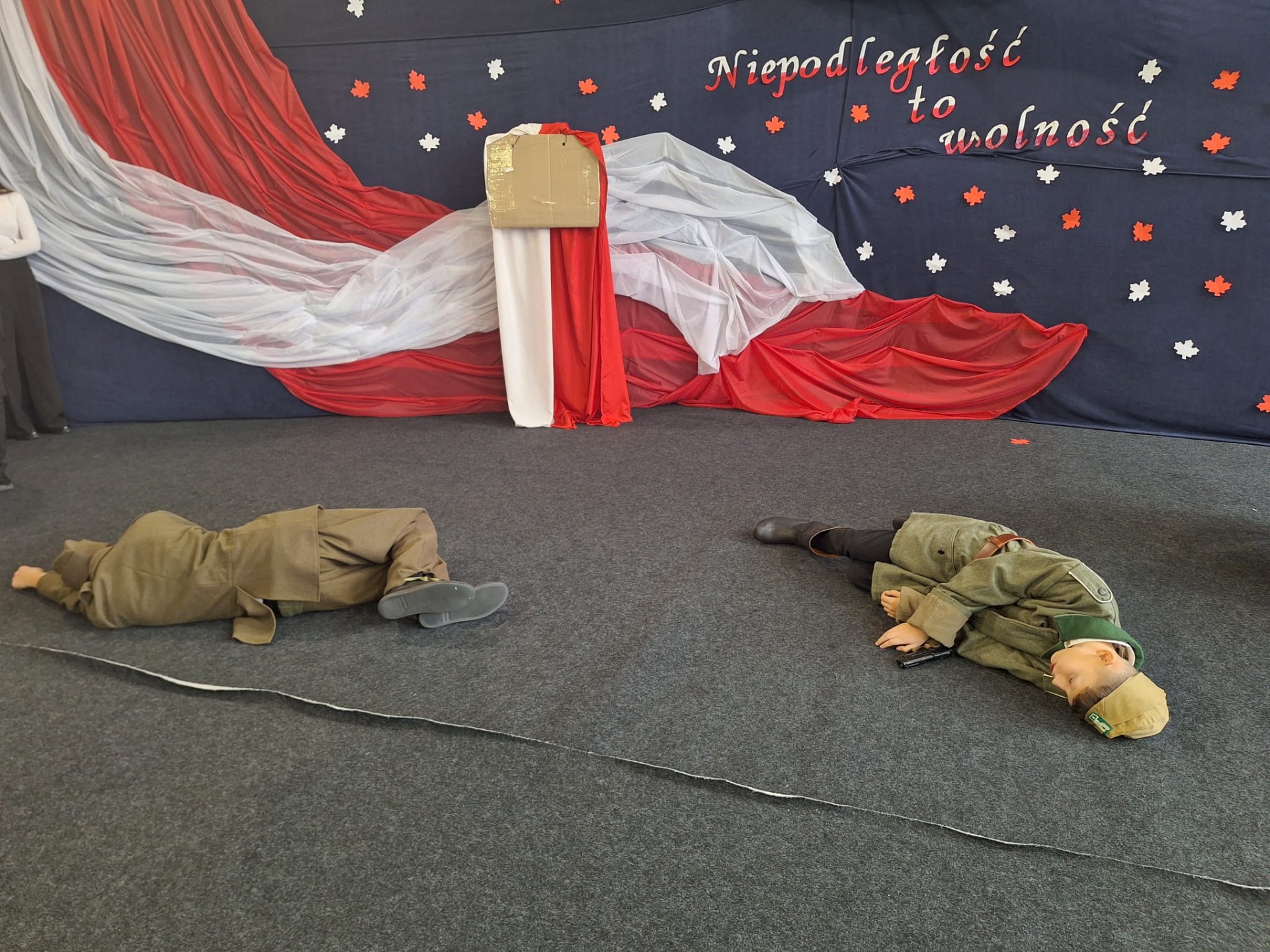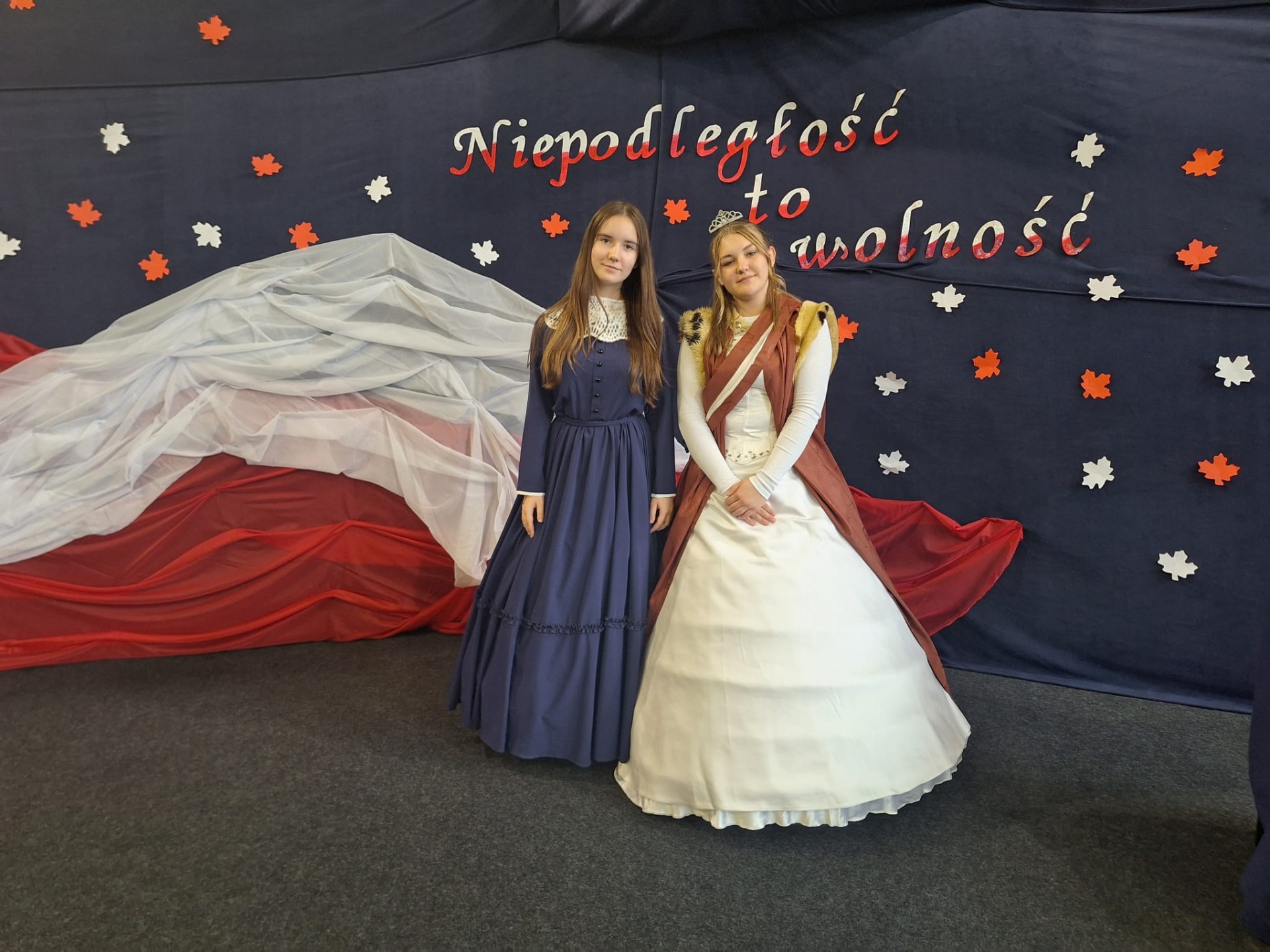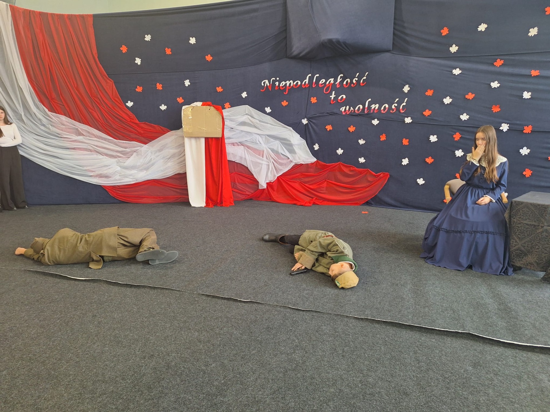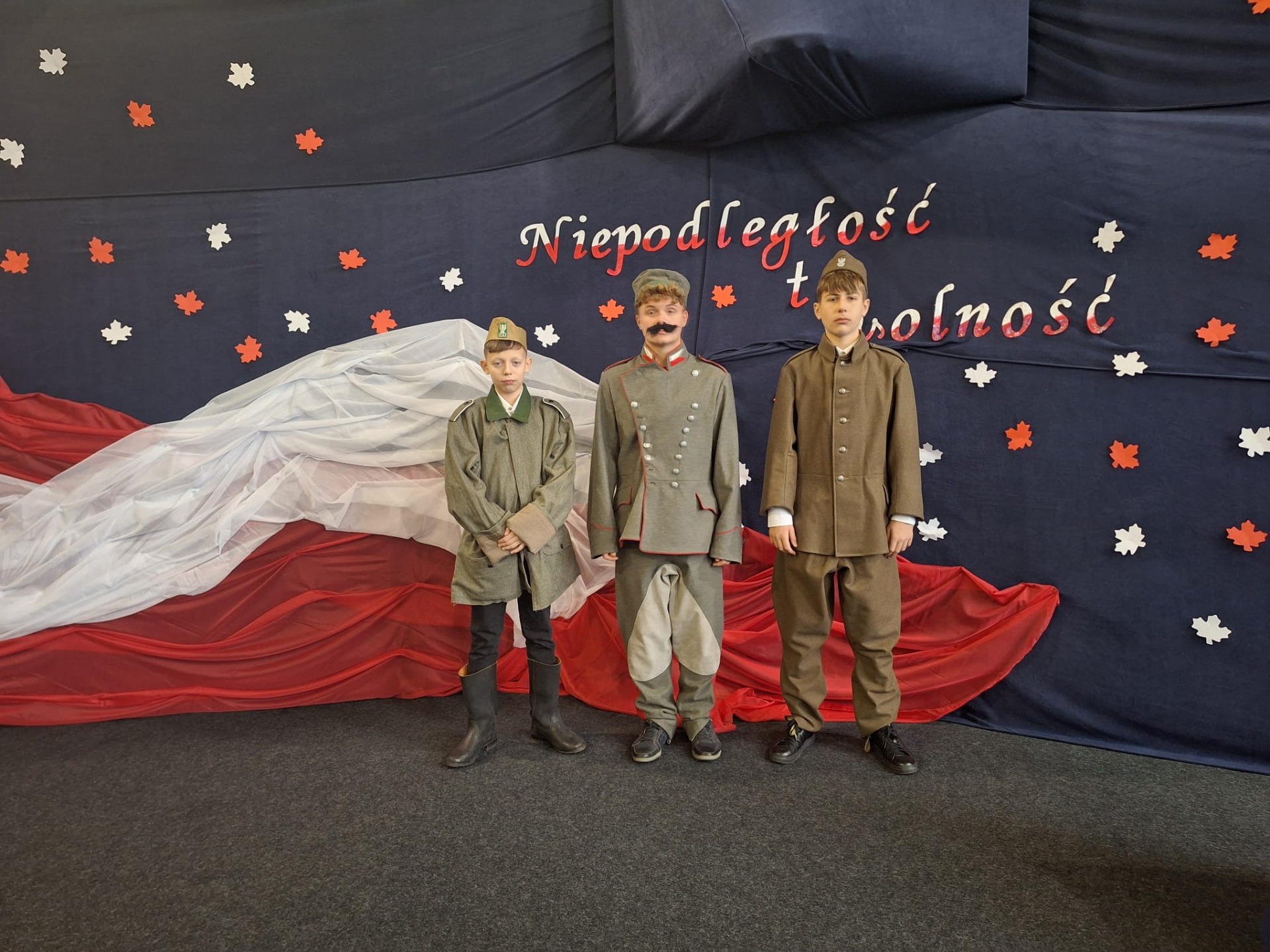 W środę 13 listopada uczniowie klasy 8 przypomnieli całej społeczności jak trudną drogę do niepodległości przeszła Polska przez 123 lata niewoli. Wspomnieli o walkach narodowowyzwoleńczych, o niezłomnej postawie Polaków w zmaganiach z rusyfikacją i germanizacją, o trudnych latach I wojny światowej. Występ miał piękną oprawę muzyczną. Na wiolonczeli zagrała Maja Łuków. Dziewczynki z klasy szóstej i ósmej zaprezentowały m.in. taniec z szarfami, a Wiktoria Goszczyńska taniec wolności.