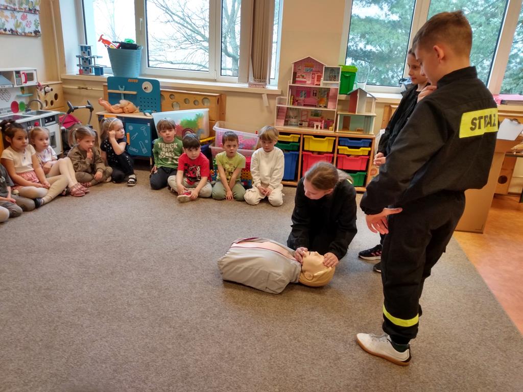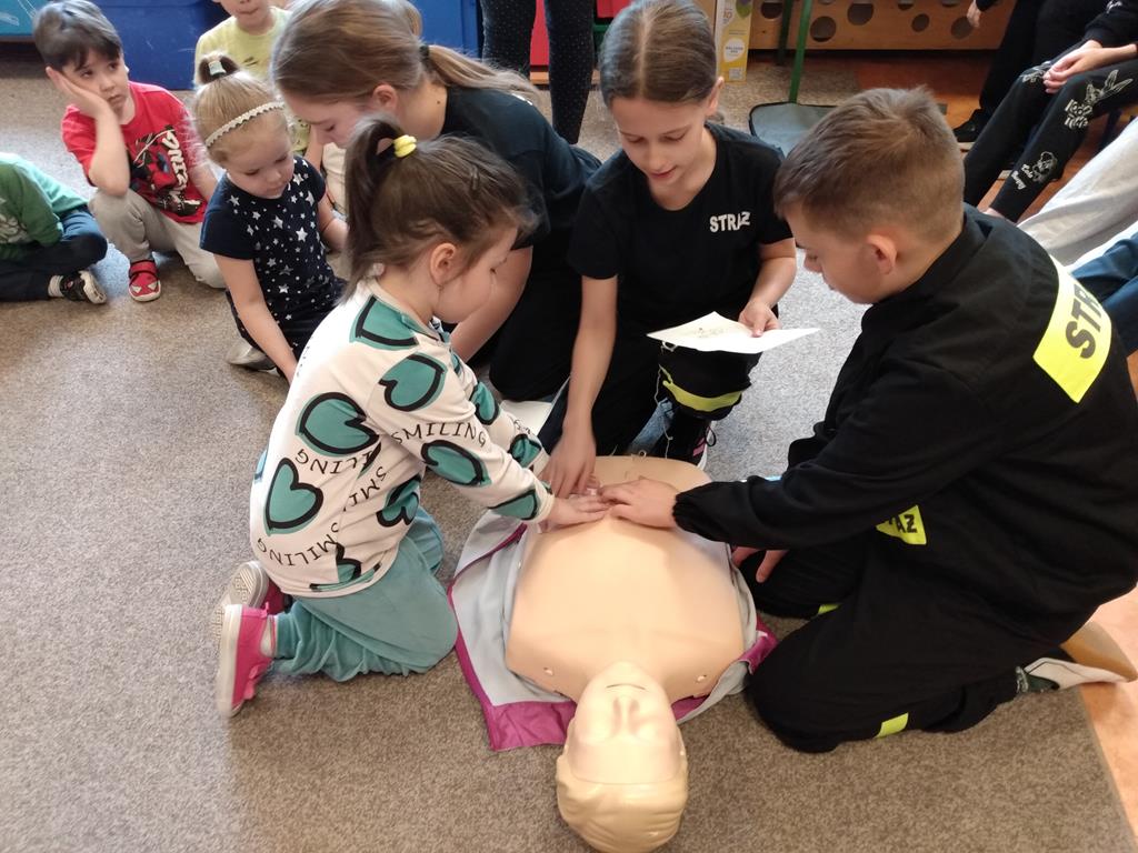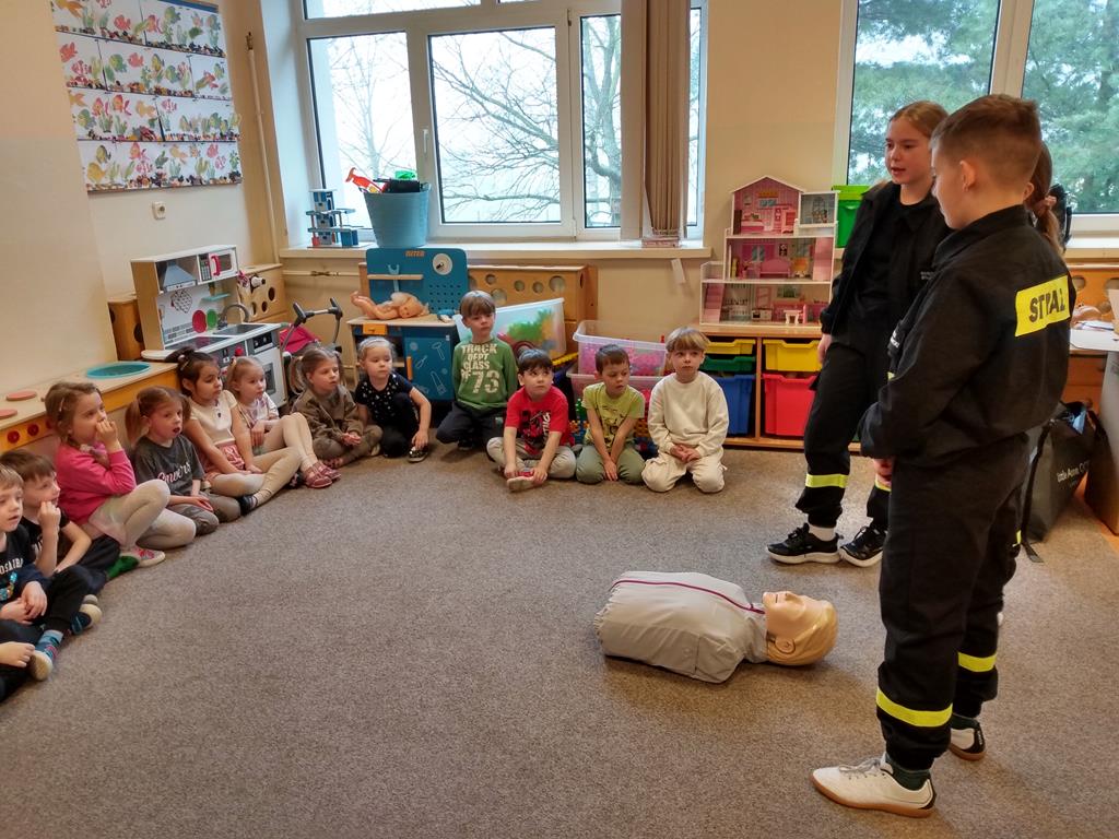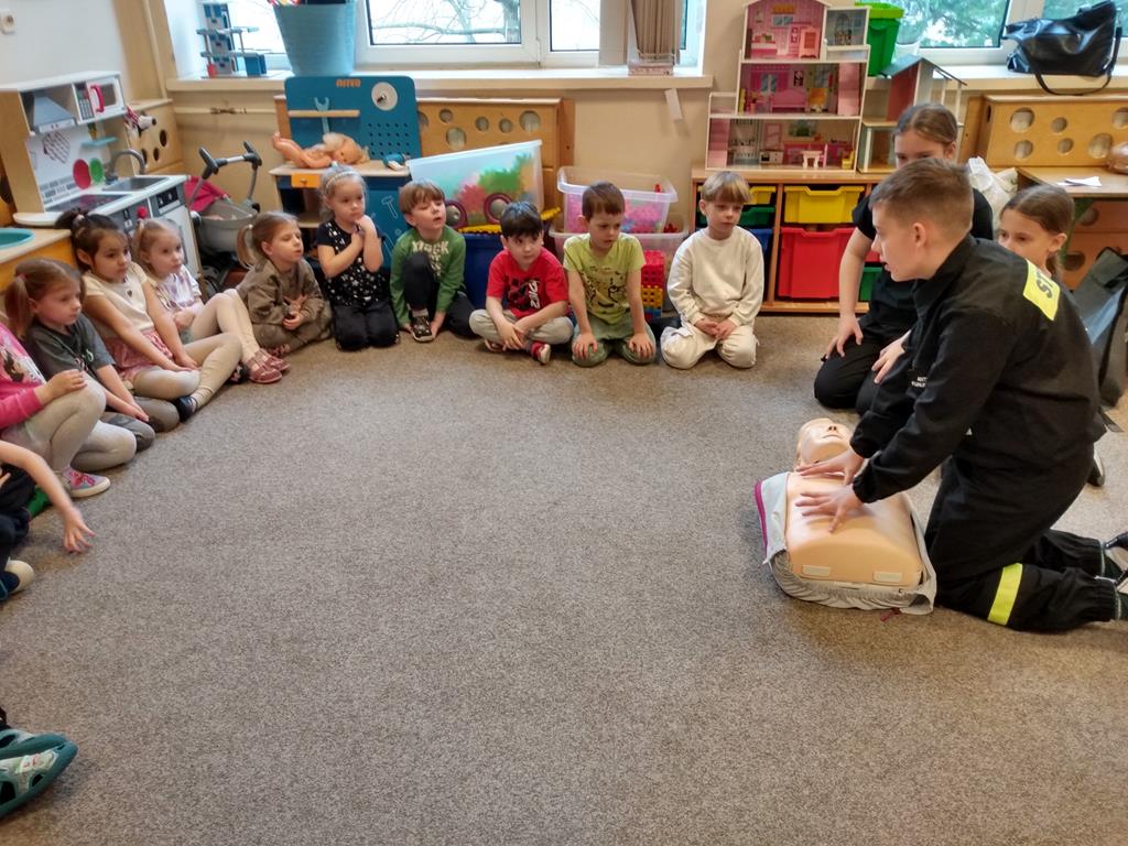 Uczniowie klasy IV z Młodzieżowej Drużyny Pożarniczej uczą przedszkolaków pierwszej pomocy