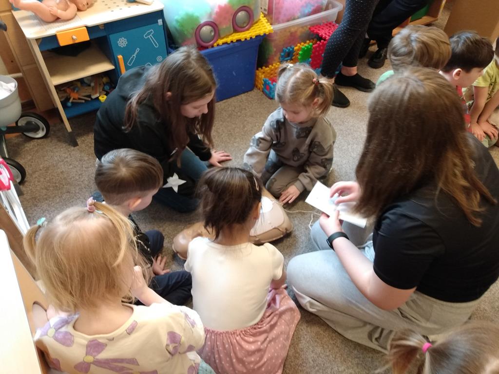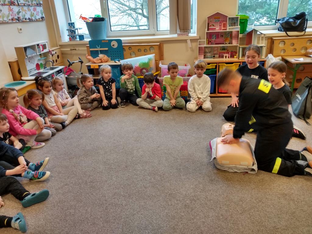 Członkowie Młodzieżowej Drużyny Pożarniczej z klasy IV, Marcelina, Hania i Antek, przeprowadzili dla przedszkolaków z grupy "Motylki" zajęcia z udzielania pierwszej pomocy.