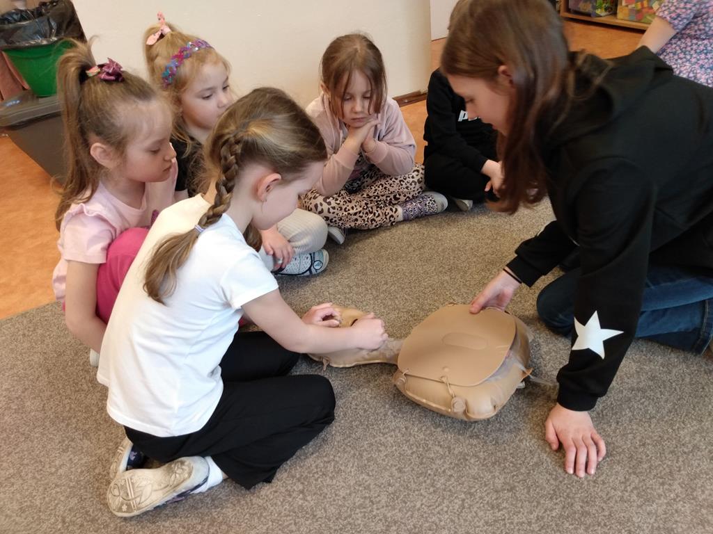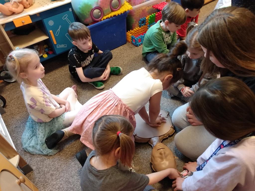 Najwięcej emocji wzbudziła jednak resuscytacja krążeniowo-oddechowa (RKO) – pod okiem starszych kolegów przedszkolaki mogły poćwiczyć uciskanie klatki piersiowej na specjalnych fantomach, które nasza Szkoła otrzymała od fundacji WOŚP w ramach szkolenia nauczycieli.