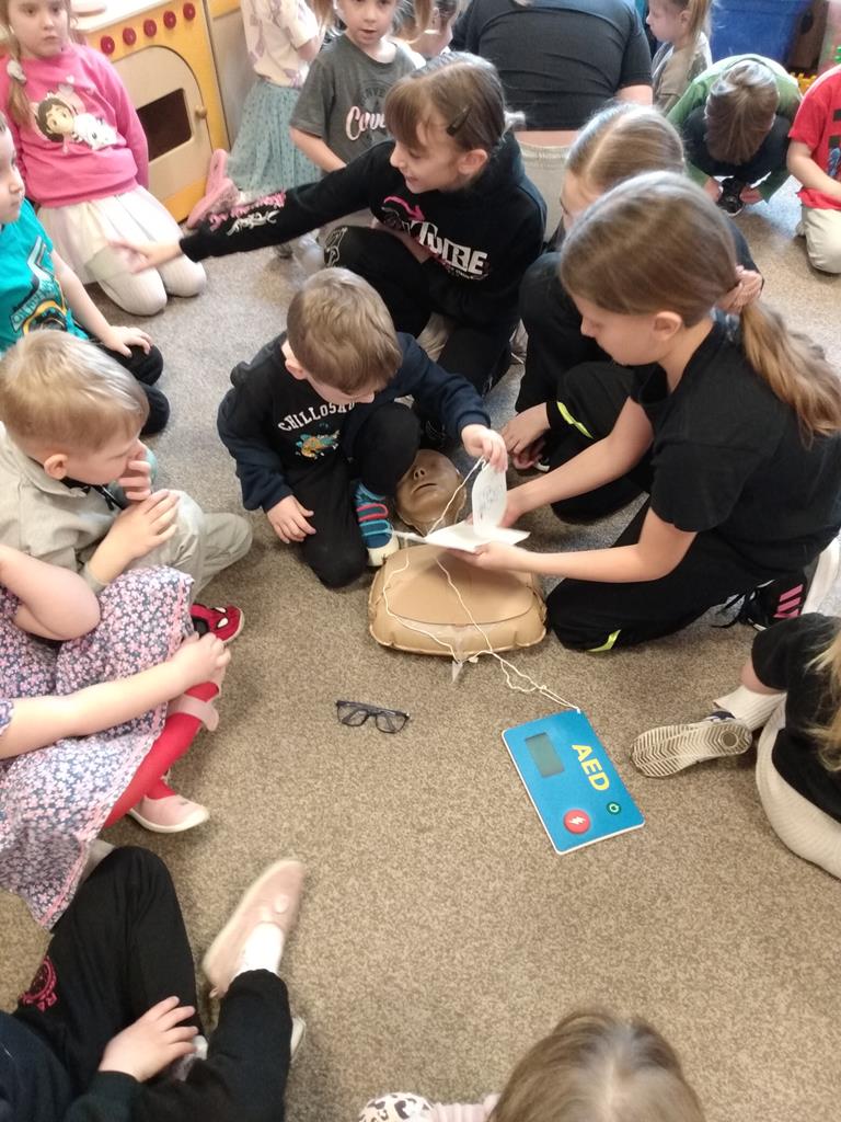 Mali uczestnicy z ciekawością odkrywali, czym jest AED (automatyczny defibrylator zewnętrzny) i dlaczego jego użycie może uratować życie.