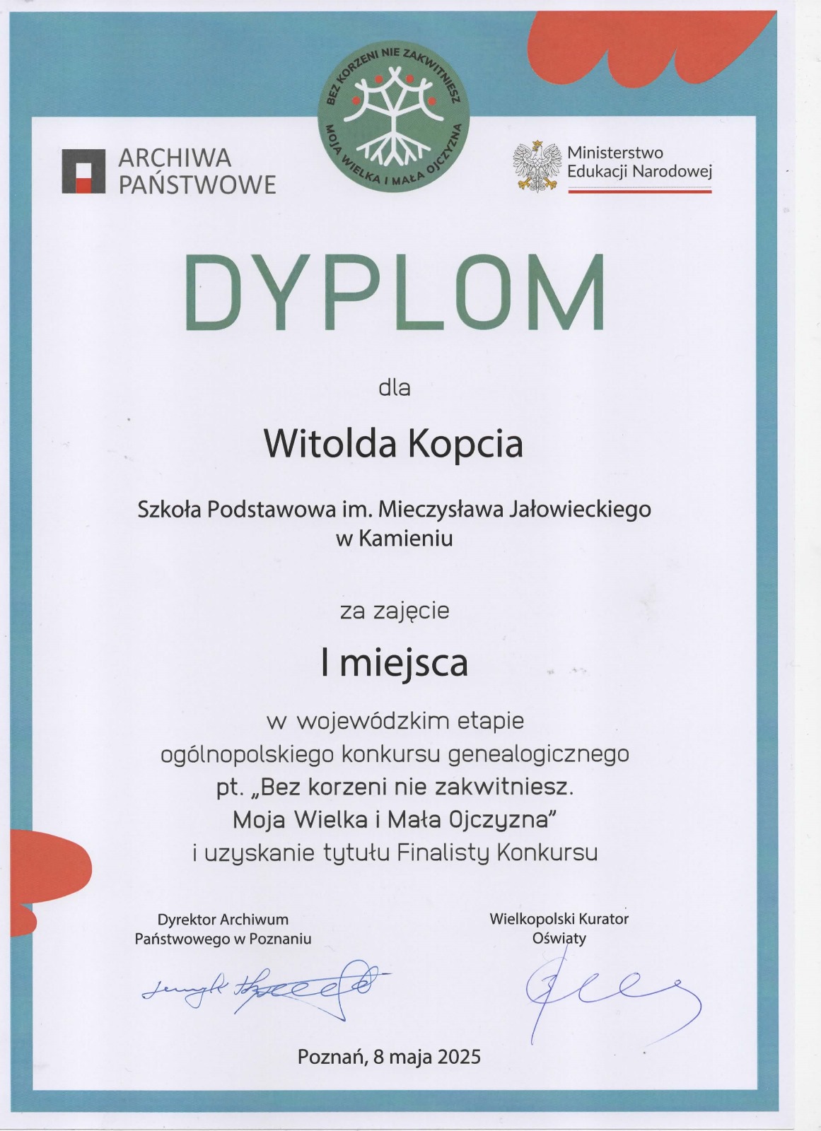 „Bez korzeni nie zakwitniesz. Moja Wielka i Mała Ojczyzna” 8 maja w siedzibie Archiwum Państwowego w Poznaniu odbyła się gala wręczenia nagród trzeciej edycji konkursu „Bez korzeni nie zakwitniesz. Moja Wielka i Mała Ojczyzna” na szczeblu wojewódzkim. Wziął w niej udział laureat I miejsca - Witold Kopeć z klasy szóstej