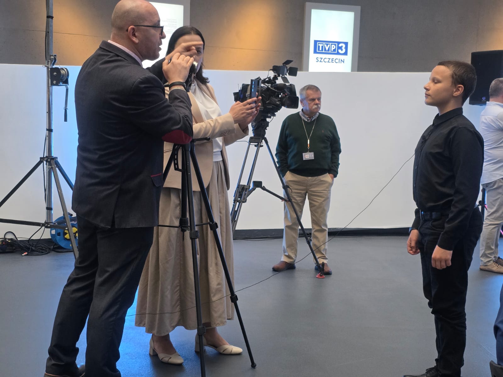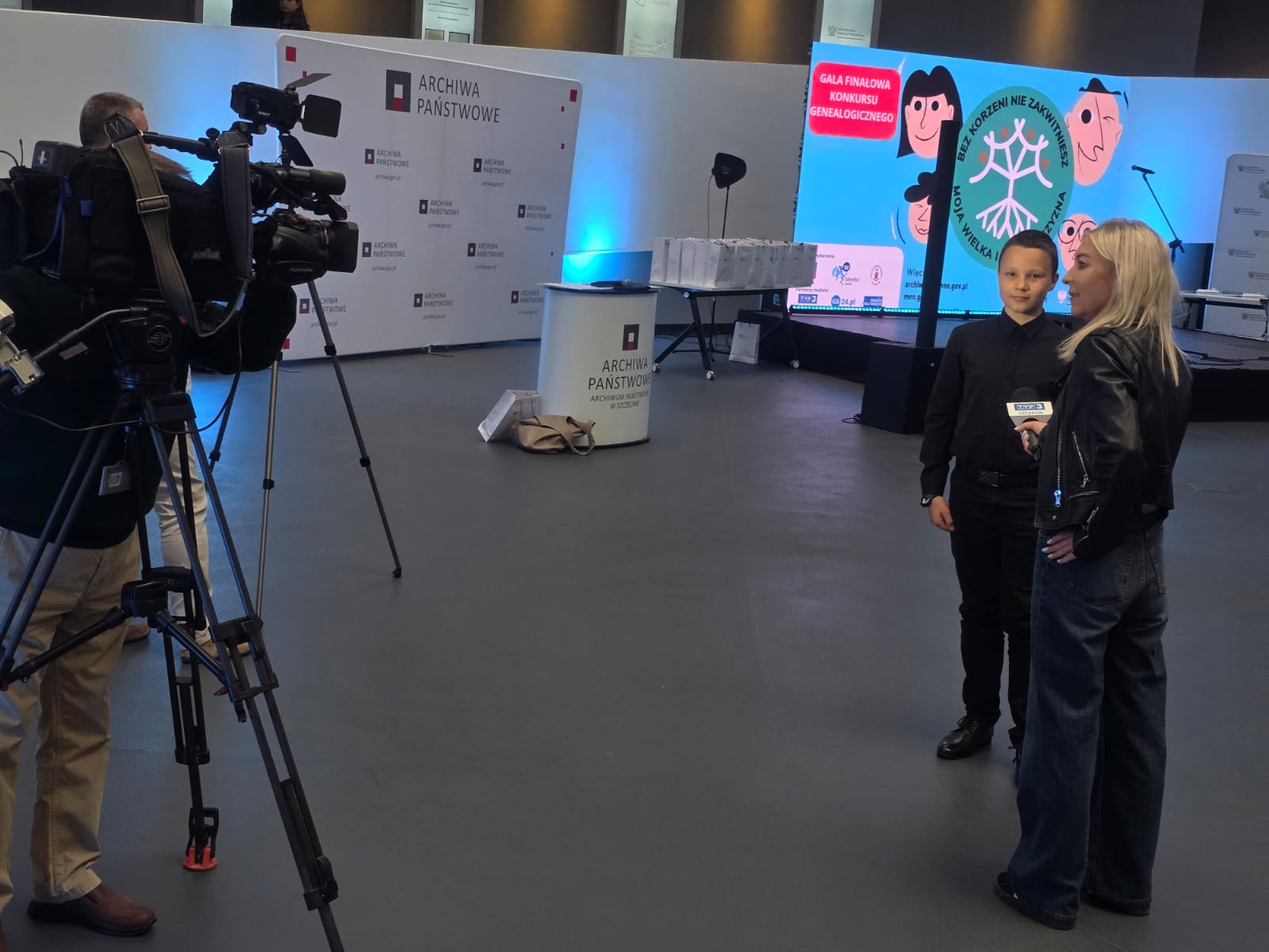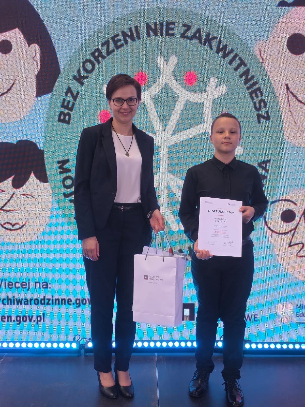 W piątek, 6 czerwca 2025r., nasz uczeń Witold Kopeć wraz z mamą oraz p. Marzeną Perugą - Malińską wziął udział w Gali Finałowej 4 edycji Ogólnopolskiego Konkursu Genealogicznego "Bez korzeni nie zakwitniesz. Moja Wielka i Mała Ojczyzna". Konkurs to wspólne przedsięwzięcie Archiwów Państwowych oraz Ministerstwa Edukacji Narodowej. Koordynatorem tegorocznej edycji było Archiwum Państwowe w Szczecinie. Gala odbyła się we wnętrzu Fabryki Wody, a przed publicznością wystąpił Zespół Pieśni i Tańca "Szczecinianie". Zaraz po ceremonii wręczenia nagród laureaci wraz z opiekunami mogli zwiedzić Edukatorium Fabryki. Następnie wyruszyli do siedziby Politechniki Morskiej, by poznać ofertę edukacyjną uczelni i jeszcze bardziej poczuć morski charakter Szczecina. Wśród zaplanowanych atrakcji były symulatory mostka i silnika statku oraz zwiedzanie statku szkoleniowego "Nawigator XXI". Dla ucznia naszej szkoły był to niezapomniany dzień. Witek udzielił aż trzech wywiadów. Jego praca wzbudziła szczególne zainteresowanie.